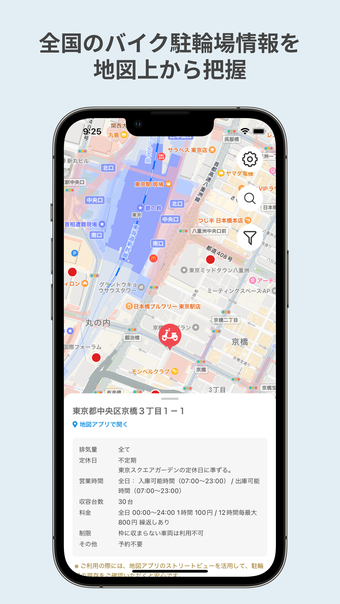 แผนที่ที่จอดรถจักรยานคือแอปพลิเคชันการเดินทางและการนำทางที่ออกแบบมาสำหรับผู้ใช้ iPhone ที่ต้องการค้นหาสถานที่จอดจักรยานทั่วญี่ปุ่น แอปฟรีนี้มีฟีเจอร์หลักหลายอย่าง รวมถึงการสำรวจจุดจอดจักรยานตามแผนที่ ซึ่งช่วยให้ผู้ใช้สามารถมองเห็นตัวเลือกที่มีอยู่ในบริเวณใกล้เคียงได้อย่างง่ายดาย ผู้ใช้สามารถรับข้อมูลรายละเอียดเกี่ยวกับแต่ละสถานที่ด้วยการแตะเพียงครั้งเดียว ทำให้สะดวกในการประเมินความเหมาะสมก่อนการมาถึง